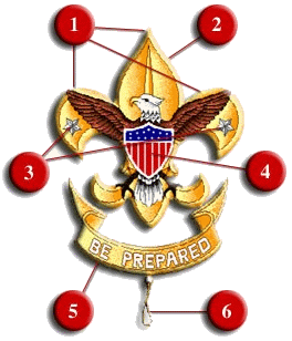 The Scout Oath or Promise On my honor I will do my best To do my duty to God and my Country and Obey the Scout Law To help other people at all times To keep myself physically strong, Mentally awake, and morally straight. The Scout Law A Scout is Trustworthy, Loyal, Helpful, Friendly, Courteous, Kind, Obedient, Cheerful, Thrifty, Brave, Clean, and Reverent. Meaning of Scout Emblem 1. The three points of the trefoil stand for the three parts of the Scout Oath. 2. The shape of the Scout badge means that a Scout can point the right way in life as does a compass in the field. 3. There are two stars on the badge. They symbolize truth and knowledge. 4. The eagle and shield stand for freedom and a Scout's readiness to defend that freedom. 5. The scroll bearing the Scout motto is turned up at the ends as a reminder that a Scout smiles as he does his duty. 6. The knot at the bottom of the scroll serves as a reminder of the Scout slogan, Do a Good Turn Daily. |